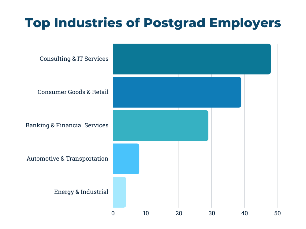 This data was gathered by reaching out to each partner university and compiling their records. The data was cleaned up and categorized. Given the diversity of our schools and their locations, the range of businesses involved is vast, spanning industries such as consulting, technology, automotive, and consumer goods